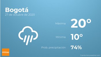 Durante la mañana en Bogotá tendremos cielos cubiertos con probabilidad de lloviznas generalizadas e intermitentes. Según pasen las horas habrá más nubes que claros con escasa probabilidad de precipitaciones. Con respecto a las temperaturas, oscilarán entre una máxima de 20 y una mínima de 10 grados. Junto a todo esto, se esperan vientos de carácter flojo con rachas de hasta 15 km/h.
