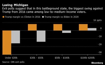 En 2016, las encuestas a boca de urna tenían a Trump a la cabeza entre todos los grupos de ingresos del estado, excepto los que ganaban menos de US$30.000 al año. Esta vez, los datos iniciales de esas mismas encuestas a boca de urna, realizadas por Edison Research para las cadenas de televisión nacionales, tenían a Biden por encima en todos los grupos, excepto aquellos que ganaban entre US$100.000 y US$200.000, e incluso allí, el margen de Trump se redujo drásticamente.