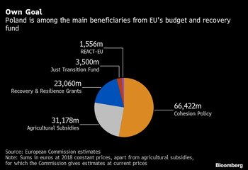 Está previsto que Hungría reciba casi 7.000 millones de euros en subvenciones del estímulo de la Unión Europea, además de sus asignaciones regulares del bloque. Polonia está en espera de casi 25.000 millones de euros de dinero extra.