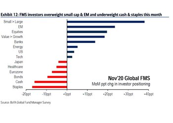 Según la encuesta mensual, realizada del 6 al 12 de noviembre, el optimismo de los inversores sobre la renta variable se disparó y las asignaciones aumentaron al nivel más alto desde enero de 2018. Las posiciones en efectivo cayeron al nivel más bajo desde abril de 2015, mientras que las expectativas de un crecimiento económico aumentaron a un máximo de 20 años. Los inversores adquirieron activos más volátiles, como títulos de empresas de baja capitalización, valor, bancos y acciones de mercados emergentes, y se alejaron de bonos y productos básicos.