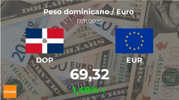 Al comienzo de la jornada el euro se negocia a las 10:01 horas a 69,32 pesos dominicanos, de manera que supuso un ascenso del 1,48% con respecto a la cifra del día anterior, cuando cerró con 68,31 pesos dominicanos.