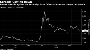 Las notas de la productora de petróleo con vencimiento en 2027 han subido 7.8% este mes, mientras que el diferencial frente a los bonos soberanos mexicanos de vencimiento similar ha caído de 578 puntos básicos a 460.