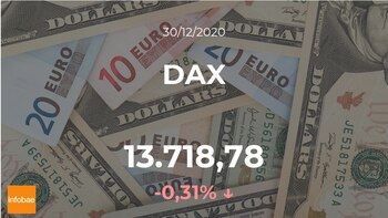 Sesión bajista para el DAX, que acabó la jornada del miércoles 30 de diciembre con ligeras bajadas del 0,31%, hasta los 13.718,78 puntos. El DAX marcó un máximo de 13.797,09 puntos y un volumen mínimo de 13.717,47 puntos. El rango de cotización para el DAX entre su punto más alto y el más bajo (máximo-mínimo) durante este día se situó en el 0,58%.