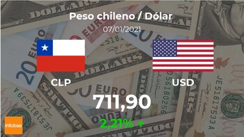 El dólar estadounidense se negoció a las 19:00 horas a 711,90 pesos chilenos, lo cual implicó una subida del 2,21% si se compara con el dato del día previo, cuando cotizó a 696,50 pesos chilenos.