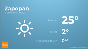 Para hoy en Zapopan tendremos cielos despejados. Con respecto a las temperaturas, estas oscilarán entre los 25 grados de máxima y 2 de mínima. Viento del sur sin apenas intensidad con rachas de hasta 15 km/h.