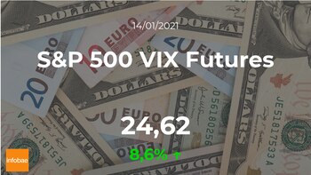 En referencia a la rentabilidad de los últimos siete días, el S&P 500 VIX Futures marca un ascenso del 8,12%; sin embargo desde hace un año todavía mantiene una bajada del 64,23%. El S&P 500 VIX Futures se sitúa un 6,28% por debajo de su máximo en lo que va de año (26,27 puntos) y un 8,6% por encima de su valoración mínima del año en curso (22,67 puntos).