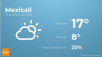 Para hoy por la mañana en Mexicali tendremos nubes y claros con escasa probabilidad de precipitaciones. Por la tarde habrá cielos nubosos con poca probabilidad de lluvias. Las temperaturas se moverán entre una máxima de 17 y una mínima de 8 grados. Viento del oeste de poca intensidad con cifras de hasta 24 kilómetros por hora.