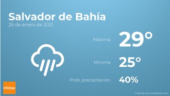 A lo largo del día de hoy en Salvador de Bahía el cielo estará cubierto con probabilidad de lloviznas generalizadas. Por lo que respecta a las temperaturas, estas se moverán entre una máxima de 29 y una mínima de 25 grados. Viento de poca intensidad con rachas de hasta 28 kilómetros por hora.
