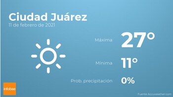 Durante las primeras horas del día en Ciudad Juárez habrá cielos despejados. A medida que avance el día se esperan nubes y claros con escasa probabilidad de precipitaciones. Las temperaturas estarán entre los 27 grados de máxima y 11 de mínima. En general, vientos del sureste de carácter flojo con rachas de hasta 26 kilómetros por hora.