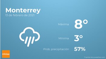 Para las primeras horas del día en Monterrey habrá cielos cubiertos con probabilidad de lloviznas generalizadas e intermitentes. Según pasen las horas se prevén nubes y claros con probabilidad de alguna llovizna. Las temperaturas se moverán entre una máxima de 8 y una mínima de 3 grados. En general, vientos del noreste de carácter flojo con cifras de hasta 11 kilómetros por hora.