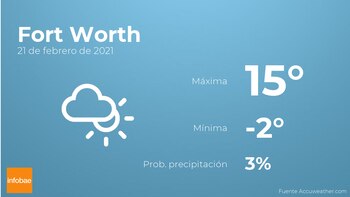 Hoy por la mañana en Fort Worth tendremos más nubes que claros. Por la tarde se prevén nubes y claros. Por lo que respecta a las temperaturas, estas variarán entre una máxima de 15 y una mínima de -2 grados. Junto a todo esto, se esperan vientos de carácter flojo con valores de hasta 28 kilómetros por hora.