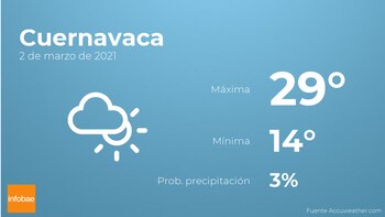 Durante las primeras horas del día en Cuernavaca habrá más nubes que claros. Según pasen las horas tendremos cielos sin nubes. Con respecto a las temperaturas, oscilarán entre una máxima de 29 y una mínima de 14 grados. Además, se esperan vientos de carácter débil con rachas de hasta 13 kilómetros por hora.