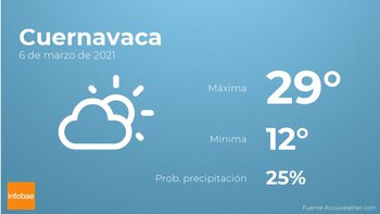 Hoy a primera hora en Cuernavaca tendremos nubes escasas con poca probabilidad de lluvias. Por la tarde se prevén cielos sin nubes. En relación a las temperaturas, estas variarán entre una máxima de 29 y una mínima de 12 grados centígrados. Además, se esperan vientos del sur sin apenas intensidad con rachas de hasta 15 kilómetros por hora.