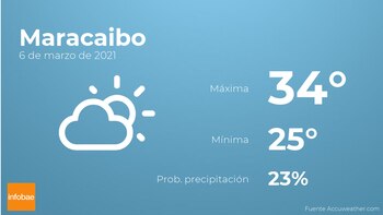En la mañana de hoy en Maracaibo tendremos escasa nubosidad con poca probabilidad de precipitaciones. Según pasen las horas se esperan más nubes que claros con poca probabilidad de lluvias. Con respecto a las temperaturas, estas variarán entre los 34 grados de máxima y 25 de mínima. Además, se esperan vientos del este de carácter débil con rachas de hasta 20 km/h.