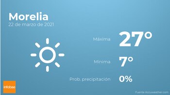 A lo largo del día de hoy en Morelia habrá cielos sin nubes. En cuanto a las temperaturas, oscilarán entre una máxima de 27 y una mínima de 7 grados centígrados. Junto a todo esto, se esperan vientos de carácter flojo con rachas de hasta 20 kilómetros por hora.