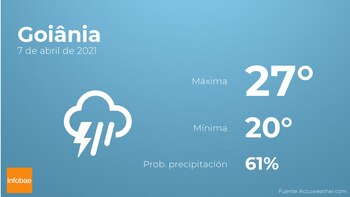 En las primeras horas del día en Goiânia tendremos cielos cubiertos con probabilidad de tormentas acompañadas de lluvia. A medida que avance el día se prevén más nubes que claros con baja probabilidad de que haya precipitaciones. En relación a las temperaturas, estas se moverán entre los 27 grados de máxima y 20 de mínima. Además, se esperan vientos de carácter flojo con rachas de hasta 13 km/h.