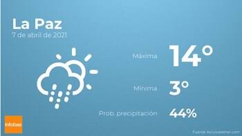 Durante las primeras horas del día en La Paz se prevén más nubes que claros con probabilidad de alguna llovizna. Según pasen las horas habrá más nubes que claros con baja probabilidad de que haya precipitaciones. En relación a las temperaturas, estas variarán entre los 14 grados de máxima y 3 de mínima. Además, se esperan vientos del sureste de poca intensidad con cifras de hasta 18 km/h.