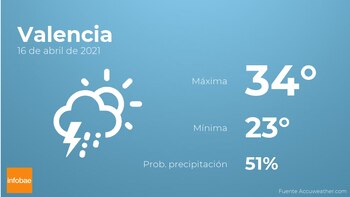 Para hoy en Valencia se esperan nubes y claros con probabilidad de tormentas y lluvia. Por lo que respecta a las temperaturas, estas oscilarán entre los 34 grados de máxima y 23 de mínima. Junto a todo esto, se esperan vientos del sureste de carácter débil con rachas de hasta 13 km/h.