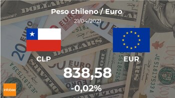 El euro se negoció a las 19:47 horas a 838,58 pesos chilenos, un ligero -0,02% de cambio con la sesión precedente.