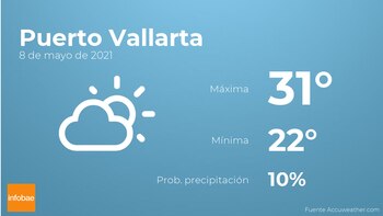 En las primeras horas del día en Puerto Vallarta se prevé escasa nubosidad. A medida que avance el día se esperan pocas nubes con poca probabilidad de precipitaciones. Por lo que respecta a las temperaturas, estas variarán entre una máxima de 31 y una mínima de 22 grados. En general, vientos de carácter flojo con cifras de hasta 22 kilómetros por hora.