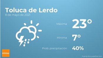 Hoy en Toluca de Lerdo se prevén nubes y claros con probabilidad de tormentas acompañadas de lluvia. En cuanto a las temperaturas, estas oscilarán entre los 23 grados de máxima y 7 de mínima. Además, se esperan vientos del norte de carácter flojo con valores de hasta 20 kilómetros por hora.