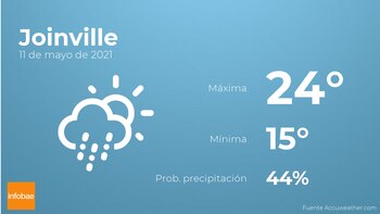 Para las primeras horas del día en Joinville habrá más nubes que claros con probabilidad de lloviznas generalizadas e intermitentes. Según pasen las horas el cielo estará cubierto con lloviznas generalizadas. Las temperaturas oscilarán entre una máxima de 24 y una mínima de 15 grados. En general, vientos de carácter débil con rachas de hasta 13 km/h.