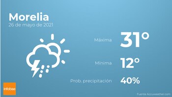 Hoy a primera hora en Morelia habrá nubes y claros con probabilidad de tormentas y lluvia. Según pasen las horas se prevé nubes escasas. En cuanto a las temperaturas, estas se moverán entre los 31 grados de máxima y 12 de mínima. Además, se esperan vientos sin apenas intensidad con rachas de hasta 15 kilómetros por hora.