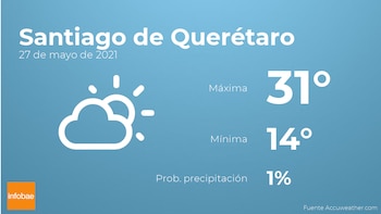 Para el día de hoy en Santiago de Querétaro tendremos nubes y claros. En relación a las temperaturas, estas oscilarán entre una máxima de 31 y una mínima de 14 grados centígrados. En general, vientos del noreste de poca intensidad con cifras de hasta 28 kilómetros por hora.