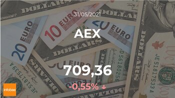Jornada negativa para el AEX, que acabó la jornada del lunes 31 de mayo con ligeras caídas del 0,55%, hasta los 709,36 puntos. El AEX llegó a un volumen máximo de 714,57 puntos y un volumen mínimo de 709,02 puntos. El rango de cotización para el AEX entre su punto más alto y el más bajo (máximo-mínimo) durante este día se situó en el 0,78%.