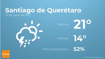 Para hoy por la mañana en Santiago de Querétaro tendremos nubes y claros con probabilidad de tormentas acompañadas de lluvia. Por la tarde el cielo estará cubierto con probabilidad de lloviznas generalizadas. En relación a las temperaturas, estas se moverán entre una máxima de 21 y una mínima de 14 grados. En general, vientos del sur de carácter débil con cifras de hasta 17 km/h.