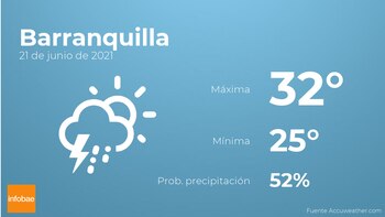 Durante la mañana en Barranquilla se prevén nubes y claros con probabilidad de tormentas acompañadas de lluvia. Según pasen las horas habrá más nubes que claros con probabilidad de tormentas acompañadas de lluvia. En relación a las temperaturas, estas variarán entre los 32 grados de máxima y 25 de mínima. Además, se esperan vientos del noreste de poca intensidad con cifras de hasta 17 km/h.