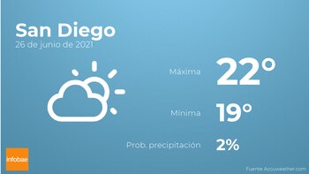 A lo largo del día de hoy en San Diego tendremos nubes y claros. Con respecto a las temperaturas, oscilarán entre una máxima de 22 y una mínima de 19 grados centígrados. Viento del oeste sin apenas intensidad con valores de hasta 33 kilómetros por hora.