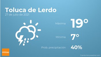 En las primeras horas del día en Toluca de Lerdo tendremos nubes y claros con probabilidad de tormentas acompañadas de lluvia. A medida que avance el día se esperan nubes y claros con poca probabilidad de lluvias. Con respecto a las temperaturas, variarán entre una máxima de 19 y una mínima de 7 grados. Además, se esperan vientos de poca intensidad con valores de hasta 18 km/h.