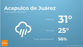 Para las primeras horas del día en Acapulco de Juárez el cielo estará cubierto con probabilidad de lluvia. A medida que avance el día el cielo estará cubierto con probabilidad de tormentas acompañadas de lluvia. En cuanto a las temperaturas, variarán entre una máxima de 31 y una mínima de 25 grados centígrados. Viento del oeste de carácter débil con cifras de hasta 18 km/h.