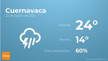 Para las primeras horas del día en Cuernavaca tendremos cielos cubiertos con probabilidad de tormentas acompañadas de lluvia. A medida que avance el día se prevé nubes escasas con baja probabilidad de que haya precipitaciones. Con respecto a las temperaturas, estas variarán entre los 24 grados de máxima y 14 de mínima. Viento de carácter flojo con valores de hasta 15 kilómetros por hora.