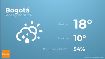 Para las primeras horas del día en Bogotá se prevén nubes y claros con probabilidad de lloviznas generalizadas. Según pasen las horas tendremos más nubes que claros con probabilidad de lloviznas generalizadas e intermitentes. En relación a las temperaturas, estas variarán entre una máxima de 18 y una mínima de 10 grados centígrados. Además, se esperan vientos de carácter flojo con rachas de hasta 15 km/h.