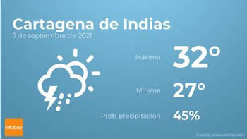 Durante la mañana en Cartagena de Indias se esperan nubes y claros con probabilidad de tormentas acompañadas de lluvia. Según pasen las horas tendremos más nubes que claros con probabilidad de tormentas y lluvia. Con respecto a las temperaturas, oscilarán entre una máxima de 32 y una mínima de 27 grados. Junto a todo esto, se esperan vientos de carácter flojo con valores de hasta 18 km/h.