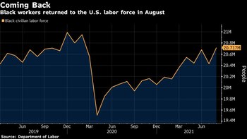 Unos 287.000 trabajadores negros ingresaron a la fuerza laboral en agosto, lo que significa que estaban empleados o buscando trabajo activamente. La mano de obra blanca y asiática se contrajo, mientras que la mano de obra hispana experimentó un pequeño aumento.