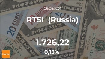 Sesión sin grandes cambios para el RTSI (Russia), que terminó la jornada del miércoles 8 de septiembre con una leve subida del 0,13%, hasta los 1.726,22 puntos. El RTSI (Russia) marcó un máximo de 1.733,71 puntos y un mínimo de 1.709,79 puntos. El rango de cotización para el RTSI (Russia) entre su punto más alto y el más bajo (máximo-mínimo) durante este día se situó en el 1,38%.