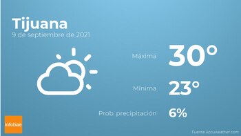 Durante las primeras horas del día en Tijuana se esperan nubes y claros. Por la tarde se espera nubes escasas. Por lo que respecta a las temperaturas, estas variarán entre una máxima de 30 y una mínima de 23 grados. Junto a todo esto, se esperan vientos de poca intensidad con valores de hasta 17 km/h.
