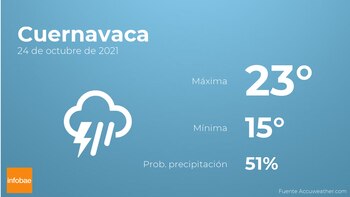 Durante las primeras horas del día en Cuernavaca el cielo estará cubierto con probabilidad de tormentas y lluvia. Según pasen las horas se esperan más nubes que claros con probabilidad de tormentas acompañadas de lluvia. Por lo que respecta a las temperaturas, estas se moverán entre los 23 grados de máxima y 15 de mínima. Además, se esperan vientos de carácter flojo con valores de hasta 11 km/h.
