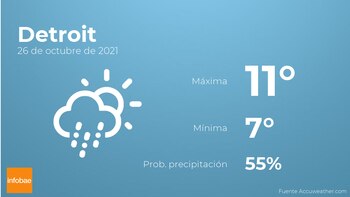 Para las primeras horas del día en Detroit habrá más nubes que claros con probabilidad de lloviznas generalizadas. Según pasen las horas se prevén más nubes que claros. Las temperaturas se moverán entre una máxima de 11 y una mínima de 7 grados. En general, vientos del norte con rachas de hasta 35 km/h.