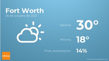 A lo largo de la mañana en Fort Worth tendremos nubes y claros con escasa probabilidad de precipitaciones. A medida que avance el día se esperan más nubes que claros con probabilidad de tormentas y lluvia. Por lo que respecta a las temperaturas, estas se moverán entre los 30 grados de máxima y 18 de mínima. En general, vientos con cifras de hasta 32 km/h.