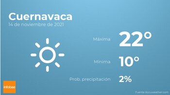 Para las primeras horas del día en Cuernavaca habrá cielos sin nubes. Por la tarde tendremos pocas nubes. Las temperaturas se moverán entre una máxima de 22 y una mínima de 10 grados centígrados. En general, vientos del sureste sin apenas intensidad con cifras de hasta 13 km/h.