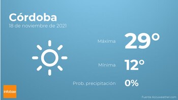 A lo largo del día de hoy en Córdoba tendremos cielos despejados. Por lo que respecta a las temperaturas, estas variarán entre los 29 grados de máxima y 12 de mínima. Junto a todo esto, se esperan vientos de poca intensidad con rachas de hasta 18 km/h.