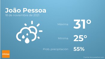 A lo largo de la mañana en João Pessoa tendremos nubes y claros con probabilidad de lloviznas generalizadas. Según pasen las horas se esperan nubes y claros con lloviznas generalizadas e intermitentes. Por lo que respecta a las temperaturas, estas variarán entre los 31 grados de máxima y 25 de mínima. Además, se esperan vientos del sureste sin apenas intensidad con valores de hasta 32 kilómetros por hora.