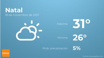 Durante la mañana en Natal tendremos escasa nubosidad. Según pasen las horas se prevén más nubes que claros con poca probabilidad de lluvias. En cuanto a las temperaturas, oscilarán entre una máxima de 31 y una mínima de 26 grados centígrados. Viento con rachas de hasta 35 km/h.