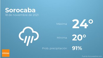 Para las primeras horas del día en Sorocaba se prevén cielos cubiertos con lloviznas generalizadas. A medida que avance el día el cielo estará cubierto con lluvia. Por lo que respecta a las temperaturas, estas se moverán entre los 24 grados de máxima y 20 de mínima. En general, vientos del norte sin apenas intensidad con valores de hasta 17 km/h.