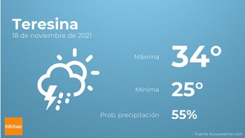 Para hoy por la mañana en Teresina se prevén nubes y claros con probabilidad de tormentas y lluvia. A medida que avance el día tendremos nubes y claros con poca probabilidad de lluvias. Por lo que respecta a las temperaturas, estas variarán entre una máxima de 34 y una mínima de 25 grados centígrados. Además, se esperan vientos del sureste de carácter débil con valores de hasta 13 kilómetros por hora.