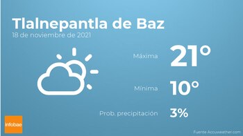 Hoy por la mañana en Tlalnepantla de Baz se prevé nubes escasas. Por la tarde habrá cielos cubiertos con probabilidad de alguna llovizna. Con respecto a las temperaturas, variarán entre una máxima de 21 y una mínima de 10 grados centígrados. Viento del noreste sin apenas intensidad con rachas de hasta 20 km/h.